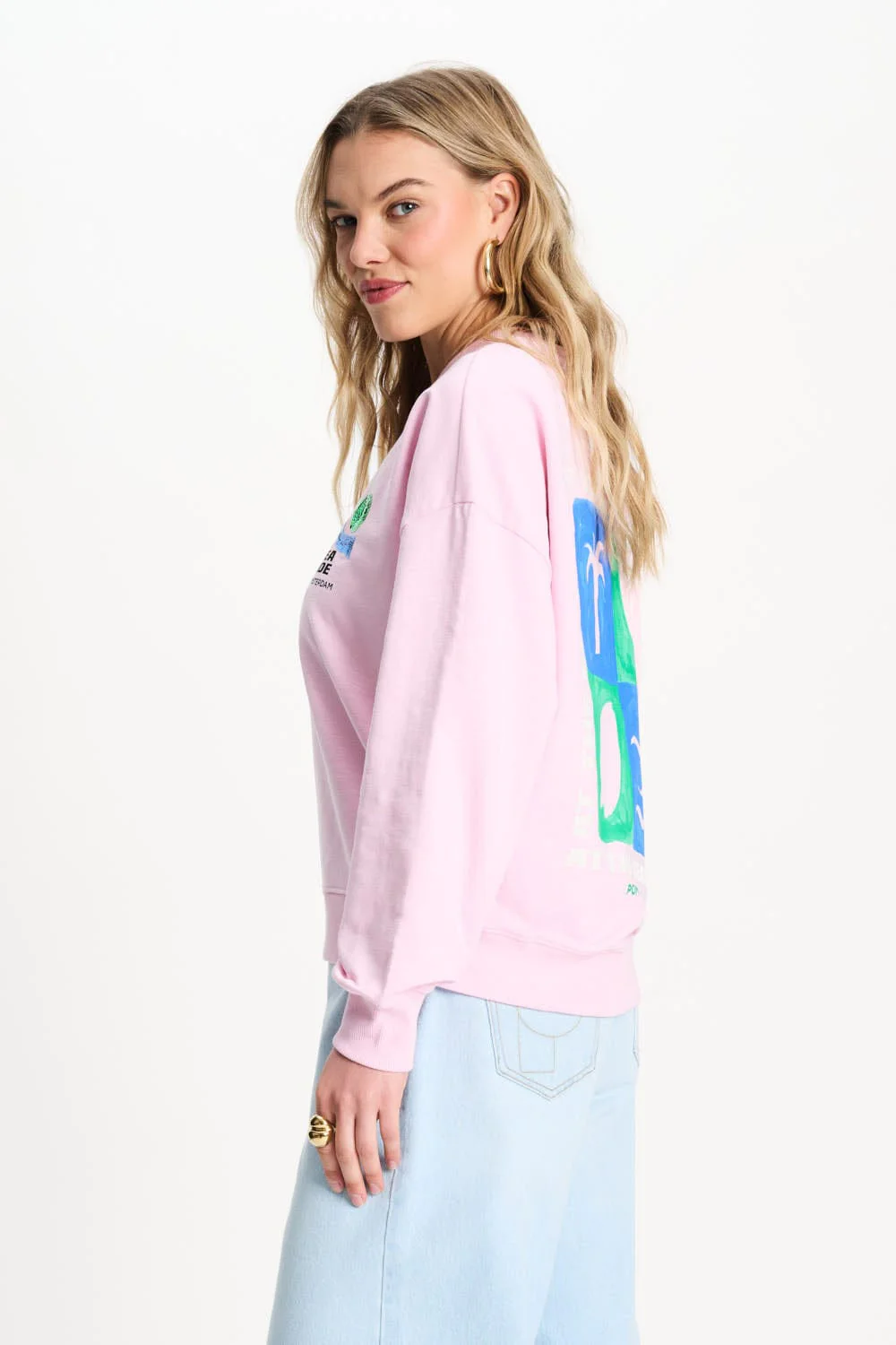 Pink sweater with subtle 'At The Seaside' print, made from 95% organic cotton.