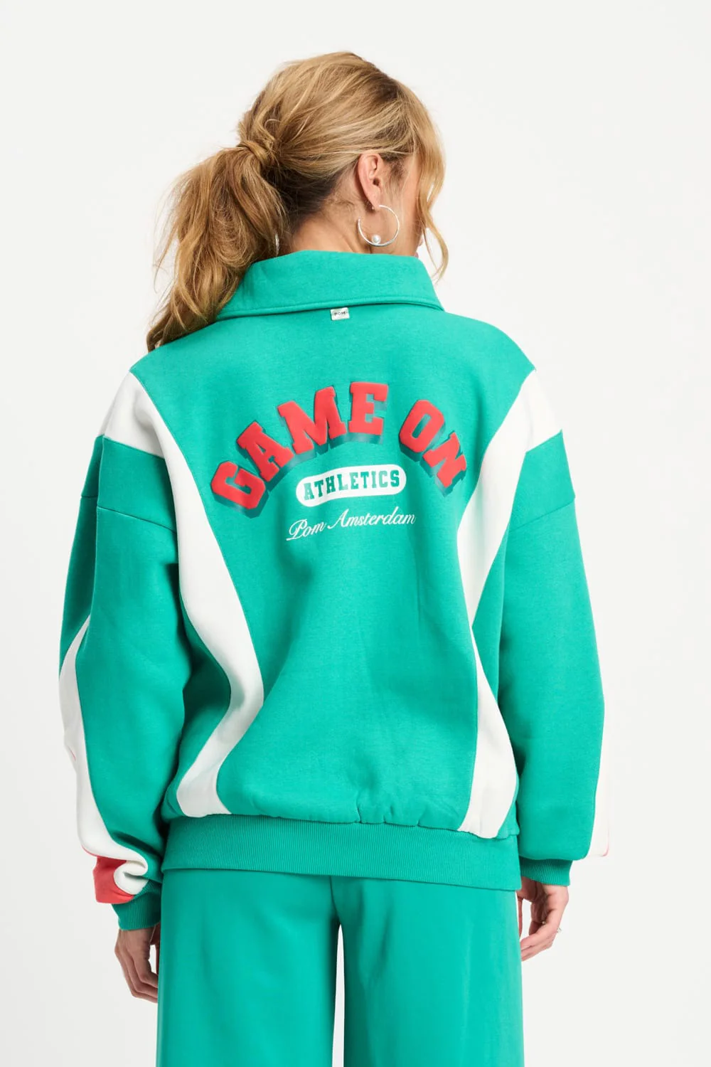This colourblock sweater from the collaboration with Gwen van Poorten in green, white and orange offers comfort thanks to the polo collar with zip fastening and the soft brushed inside.