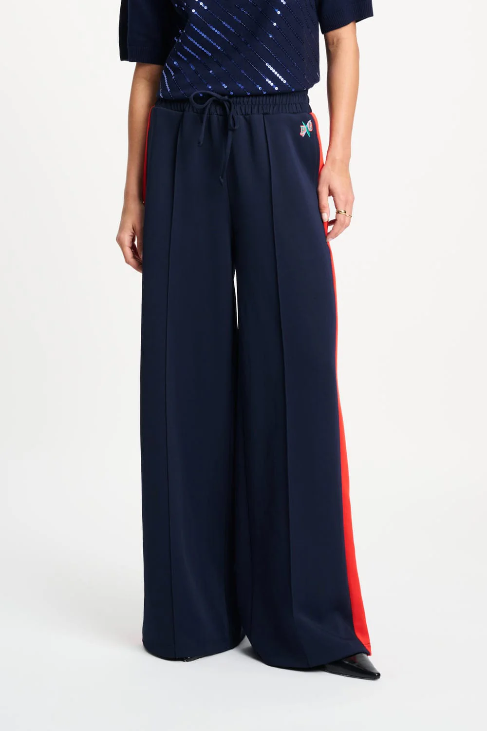 These dark blue track pants with coral-red side stripes, created in collaboration with Gwen van Poorten, feature an elastic waistband with drawstring. The wide-leg trousers have zippers at the hem, allowing you to open the bottom for an extra wide effect.